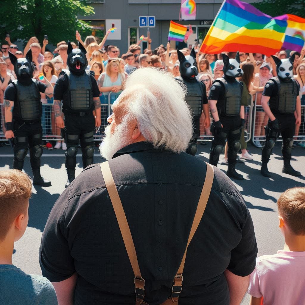 But isn’t that how the world is? There are people on the right and on the left who shun me. Shunned for being a pervert by the right, and shunned for not being a pervert by the left. Let the pride parade march by with their gay flags, fetish bondage gear, their “puppy play” masks, and drag queens prancing around to entertain the children in the crowd. This is stuff that used to happen in the back rooms of a gay bar at midnight. Now it's just right there in the street and covered by the news media. And never at any point did it represent my own lived experience. Apparently, only certain “experiences” are worth “representing.”